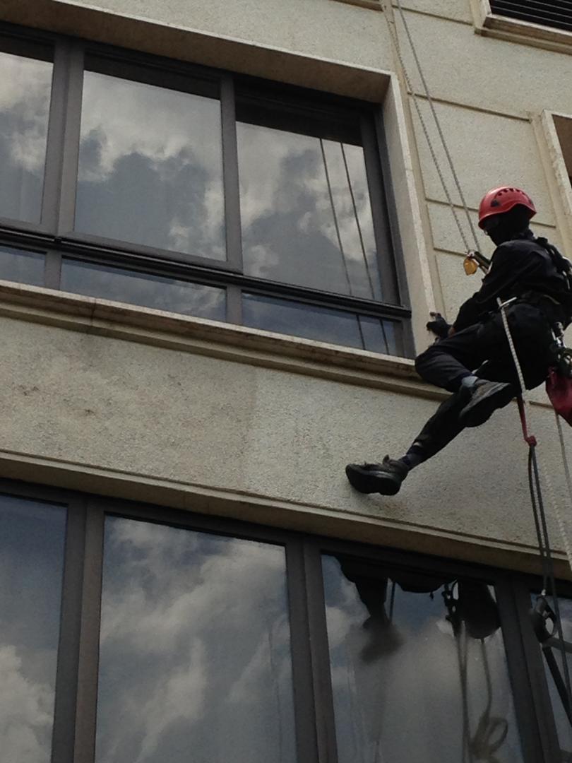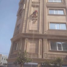 پاکسازی نمای ساختمان به علت ریخته شدن بتن روی نما.